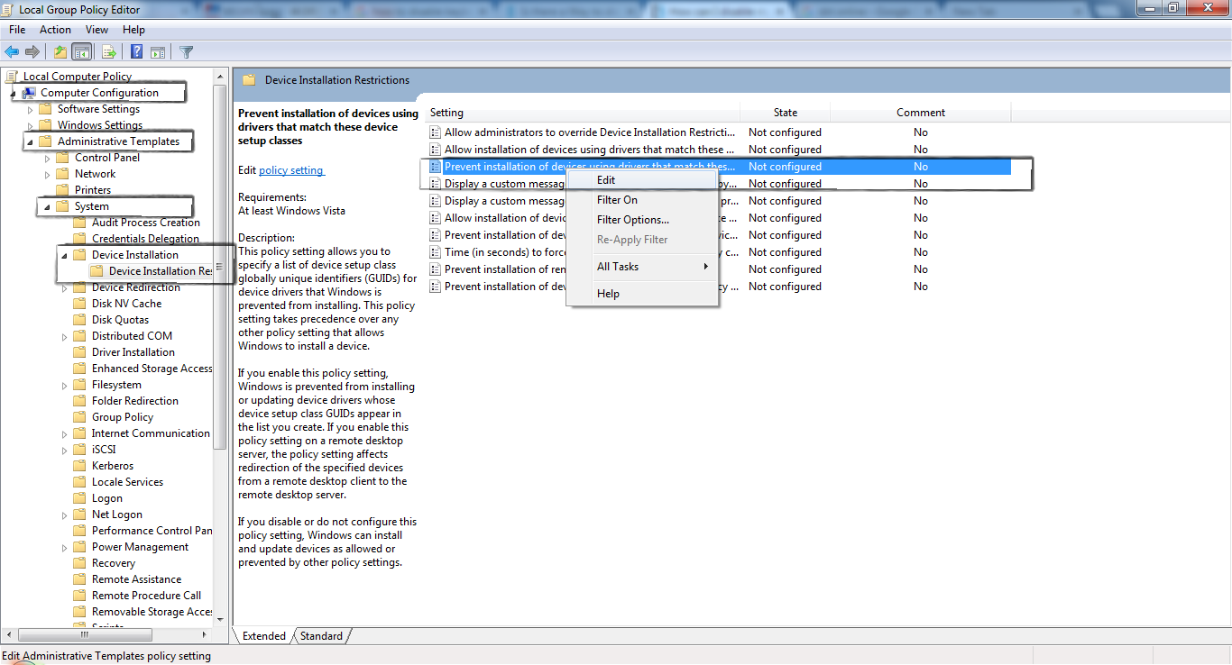 4. Right Click on ‘Prevent Installation of Devices not described by other policy settings‘
